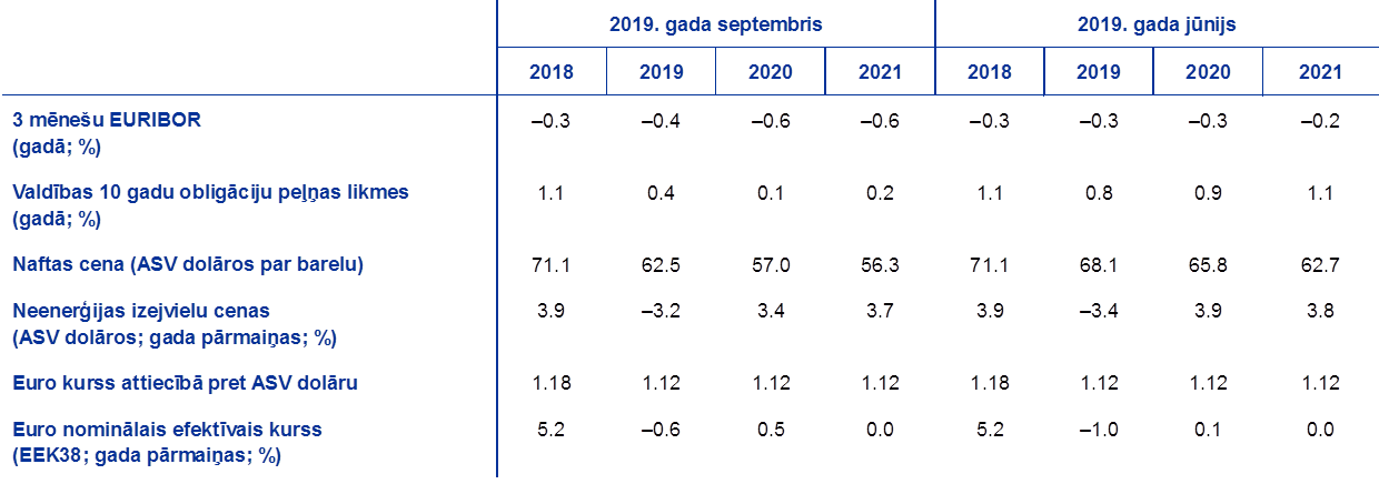 Salīdzinājumā ar 2019. gada jūnija iespēju aplēsēm tehniskie pieņēmumi ietver zemākas naftas cenas un būtiski zemākas procentu likmes. Tehniskie pieņēmumi par procentu likmēm un izejvielu cenām balstīti uz tirgus gaidām atbilstoši stāvoklim 2019. gada 19. augustā. Īstermiņa procentu likmes attiecas uz 3 mēnešu EURIBOR, tirgus gaidas iegūstot, pamatojoties uz biržā tirgoto nākotnes līgumu procentu likmēm. Saskaņā ar attiecīgo metodiku šo īstermiņa procentu likmju vidējais rādītājs 2019. gadā būs –0.4%, bet 2020. un 2021. gadā – –0.6%. Tirgus gaidas attiecībā uz euro zonas valstu valdības 10 gadu obligāciju nominālajām peļņas likmēm norāda uz to, ka 2019. gadā vidējais līmenis būs 0.4%, 2020. gadā – 0.1% un 2021. gadā – 0.2%.[2] Salīdzinājumā ar 2019. gada jūnija iespēju aplēsēm tirgus gaidas attiecībā uz īstermiņa procentu likmēm 2019. gadā koriģētas un samazinātas aptuveni par 10 bāzes punktiem, 2020. gadā – par 30 bāzes punktiem un 2021. gadā – aptuveni par 40 bāzes punktiem, savukārt attiecībā uz euro zonas valstu valdības 10 gadu obligāciju nominālajām peļņas likmēm 2019. gadā tās koriģētas un samazinātas aptuveni par 40 bāzes punktiem, 2020. gadā – par 80 bāzes punktiem un 2021. gadā – aptuveni par 90 bāzes punktiem.