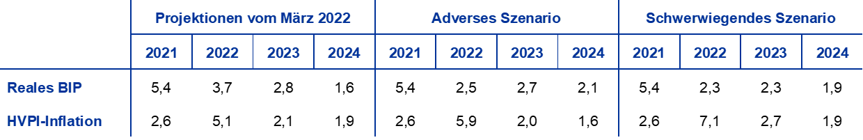 Da sehr ungewiss ist, welche Auswirkungen der Konflikt in der Ukraine auf die Wirtschaft im Euroraum haben wird, wurden neben dem Basisszenario zwei weitere Szenarien erarbeitet. Anders als im Basisszenario wird in einem adversen Szenario unterstellt, dass strengere Sanktionen gegen Russland verhängt werden, was Störungen in den globalen Wertschöpfungsketten zur Folge hat. Anhaltende Unterbrechungen der russischen Gaslieferungen würden die Energiekosten ansteigen lassen und zu einer Drosselung der Produktion im Euroraum führen. Aufgrund der allmählichen Substitution durch andere Energiequellen wäre dies jedoch nur vorübergehend der Fall. Darüber hinaus würden die geopolitischen Spannungen länger andauern als im Basisszenario, was zusätzliche Störungen im Finanzsystem und eine länger anhaltende Unsicherheit zur Folge hätte. In einem solchen Szenario läge das BIP-Wachstum im Euroraum im Jahr 2022 1,2 Prozentpunkte unterhalb des Basisszenarios, die Inflation fiele hingegen um 0,8 Prozentpunkte höher aus. Für das Jahr 2023 wären die Unterschiede zwischen den beiden Szenarien geringer. 2024 wäre das Wachstum etwas kräftiger als im Basisszenario, da sich die Wirtschaft von dem Konjunktureinbruch in den Jahren 2022 und 2023 wieder erholen würde. Mit der Neuausrichtung der Öl- und Gasmärkte würden die starken Preisspitzen bei Energie allmählich nachlassen, was bewirken würde, dass die Inflation – insbesondere im Jahr 2024 – unter den Wert des Basisszenarios sinken würde. Ein schwerwiegendes Szenario umfasst zusätzlich zu den Merkmalen des adversen Szenarios eine stärkere Reaktion der Energiepreise infolge einschneidender Kürzungen der Liefermengen, eine stärkere Neubewertung an den Finanzmärkten und größere Zweitrundeneffekte durch steigende Energiepreise. In diesem Szenario läge das BIP-Wachstum im Jahr 2022 1,4 Prozentpunkte unter dem Wert des Basisszenarios, und die Inflationsrate wäre 2,0 Prozentpunkte höher als im Basisszenario. Auch 2023 würden ein deutlich geringeres Wachstum und eine höhere Inflation als im Basisszenario verzeichnet. Längere Störungen durch den Krieg würden dazu führen, dass sich Aufholeffekte im Jahr 2024 nur relativ begrenzt auf das Wachstum auswirken würden, während stärkere Zweitrundeneffekte die negativen Auswirkungen sinkender Energiepreise auf die Inflation wieder aufheben würden.