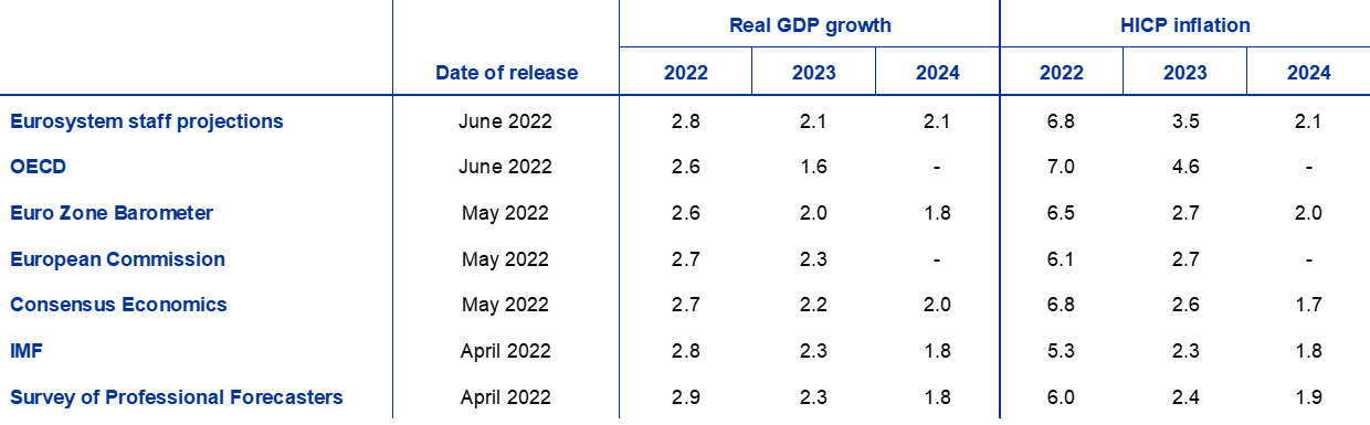 Sources: OECD June 2022 Economic Outlook 111, 8 June 2022; MJEconomics for the Euro Zone Barometer, 26 May 2022 (data for 2024 are taken from the April 2022 survey); European Commission Spring 2022 Economic Forecast, 16 May 2022; Consensus Economics Forecasts, 12 May 2022 (data for 2024 are taken from the April 2022 survey); IMF World Economic Outlook, 19 April 2022; and the ECB Survey of Professional Forecasters, for the second quarter of 2022, 15 April 2022.