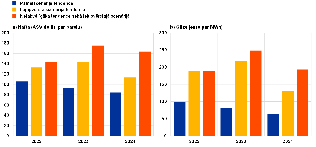 Attiecībā uz izejvielu cenām, kuru pamatā ir biržā tirgoto nākotnes līgumu cenas, kas aprēķinātas 10 darbdienu laikā pirms pēdējā termiņa beigām, tiek pieņemts, ka Brent jēlnaftas cena palielināsies no 71.1 ASV dolāra par barelu 2021. gadā līdz 105.8 ASV dolāriem par barelu 2022. gadā, iekams tā līdz 2024. gadam samazināsies līdz 84.3 ASV dolāriem par barelu. Šī tendence norāda, ka salīdzinājumā ar 2022. gada marta iespēju aplēsēm naftas cenas ASV dolāros 2022. gadā būs par 14% augstākas, 2023. gadā – par 13% augstākas un 2024. gadā – par 9% augstākas, ņemot vērā mazāku piegāžu apjomu no Krievijas saistībā ar sankcijām (sk. 2. ielikumu). Pieņēmumi par gāzes vairumtirdzniecības cenām pēdējā laikā pievienoti speciālistu iespēju aplēsēs izmantotajiem tehniskajiem pieņēmumiem. Pieņemts, ka gāzes cenas par MWh palielināsies vidēji no 47 euro 2021. gadā līdz 99 euro 2022. gadā, bet pēc tam samazināsies līdz 63 euro 2024. gadā.[5] Ietekme, ko rada alternatīvi pieņēmumi par enerģijas cenām salīdzinājumā ar pamataplēsēm, atspoguļota 5. ielikumā sniegtajā jutīguma analīzē.