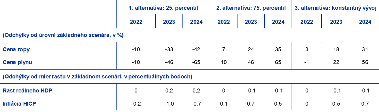 Vzhľadom na značnú neistotu spojenú s budúcim vývojom cien energií sa v tejto analýze citlivosti analyzujú mechanické implikácie alternatívneho vývoja cien energií na základné projekcie. Alternatívy pomalšieho a rýchlejšieho vývoja vychádzajú z 25. a 75. percentilu neutrálnych hustôt odvodených z cien ropných opcií 17. mája 2022 (deň uzávierky technických predpokladov uvedených v projekciách z júna 2022). Predpoklady cien ropy v základnom scenári sa nachádzajú približne v strede medzikvartilového rozpätia, čo znamená, že nedochádza k výraznému skresleniu rizík žiadnym smerom. Keďže v prípade cien plynu podobné rozdelenie neexistuje, boli odvodené z 25. a 75. percentilu rozdelenia na základe nedávnych chýb prognóz veľkoobchodných cien plynových futures.[16] Tretia alternatíva predpokladá, že ceny ropy i ceny plynu zostanú nezmenené na ich príslušnej úrovni počas dvoch týždňov pred 17. májom 2022.