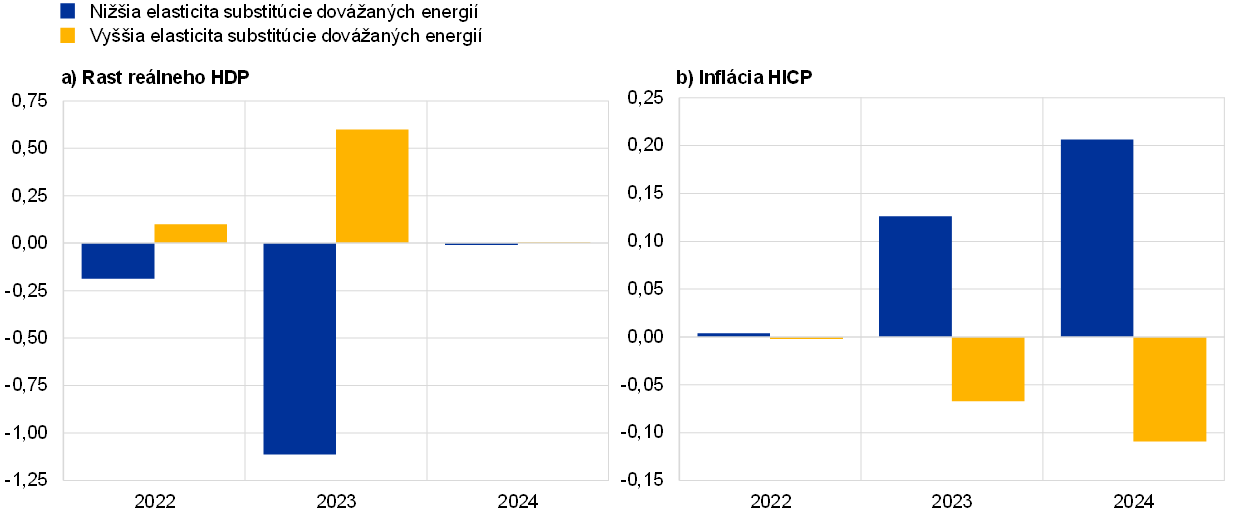 Elasticita substitúcie pri zisťovaní poklesu výroby v menej priaznivom scenári sa určuje pomocou metódy výrobnej funkcie opísanej v publikácii od Bachmann, R., Baqaee, D., Bayer, C., Kuhn, M., Löschel, A., Moll, B., Peichl, A., Pittel, K. a Schularick, M. (2022), What If? The Economic Effects for Germany of a Stop of Energy Imports from Russia, ECONtribute Policy Brief, č. 28/2022, ďalej rozvedenej v publikácii od Borin, A., Conteduca, P. O., Di Stefano, E., Mancini, M., Gunnella, V. a Panon, L. (2022, pripravuje sa). Táto elasticita súvisí s možnosťou nahradenia dovážanej energie domácimi energetickými zdrojmi alebo, všeobecnejšie, mierou, do akej sú hospodárske subjekty ochotné prerozdeliť svoje výdavky z dovozu energie na iné produkty. Na úrovni eurozóny sa predpokladá, že elasticita dosahuje približne 0,04. Na meranie citlivosti vývoja reálneho HDP a zodpovedajúcej reakcie inflácie na rôzne úrovne nahraditeľnosti sa elasticita zmenila o ±0,01, pričom vplyv tejto zmeny na makroekonomické premenné bol odvodený pomocou modelu ECB-BASE, za predpokladu rovnakého pomeru dopytových a ponukových šokov ako v menej priaznivom scenári. Viac informácií o modeli ECB-BASE sa nachádza v publikácii od Angelini, E., Bokan, N., Christoffel, K., Ciccarelli, M., Zimic, S., Introducing ECB-BASE: The blueprint of the new ECB semi-structural model for the euro area, Working Paper Series, č. 2315, ECB, 2019.
