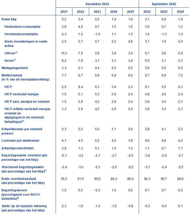 Ten opzichte van de projecties van september 2022 is de groei van het reële bbp voor 2022 met 0,3 procentpunt naar boven bijgesteld, voor 2023 met 0,4 procentpunt naar beneden, en voor 2024 onveranderd. De opwaartse bijstelling voor 2022 houdt verband met de meevallers in het tweede en derde kwartaal als gevolg van de sterker dan verwachte effecten van de heropleving van de economie na de pandemie. Deze werd slechts gedeeltelijk gecompenseerd door de neerwaartse bijstelling in het laatste kwartaal van 2022 vanwege de energiecrisis en de daarmee samenhangende verhoogde onzekerheid, het dalende vertrouwen en de hogere inflatie. Deze factoren verklaren ook de neerwaartse bijstellingen voor de eerste drie kwartalen van 2023. Hoewel de bbp-groei op kwartaalbasis naar verwachting vanaf het tweede kwartaal van 2023 begint te herstellen, lijkt het tempo trager te liggen dan in de projecties van september 2022 werd verwacht. Dit creëert een negatief overloopeffect, dat de sterkere dynamiek gedurende het jaar volledig compenseert, waardoor er geen herziening van de jaarlijkse bbp-groei in 2024 plaatsvindt.