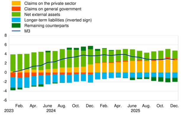 The annual growth rate of M3 in December 2025, as a reflection of changes in the items on the monetary financial institution (MFI) consolidated balance sheet other than M3 (counterparts of M3), can be broken down as follows: claims on the private sector contributed 2.8 percentage points (down from 3.1 percentage points in November), net external assets contributed 1.7 percentage points (as in the previous month), claims on general government contributed 0.3 percentage points (as in the previous month), longer-term liabilities contributed -1.1 percentage points (up from -1.2 percentage points), and the remaining counterparts of M3 contributed -0.9 percentage points (as in the previous month).