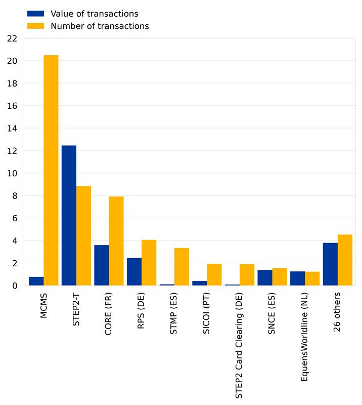 Retail payment systems located in the euro area differ significantly in terms of type, size and geographical scope of transactions they process. The three largest systems (MCMS[12], STEP2-T[13] and CORE (France)) processed 67% of the volume and 64% of the value of all transactions processed by the retail payment systems located in the euro area in the first half of 2025.
