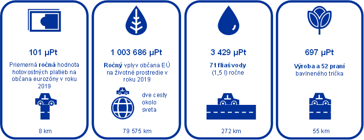Podľa záverov štúdie PEF celková známka priemernej ročnej hodnoty hotovostných platieb na občana eurozóny v roku 2019 predstavuje 101 mikrobodov (µPt). Ide o veľmi nízku známku, ktorá zodpovedá jazde občana eurozóny bežným automobilom na vzdialenosť 8 km, resp. 0,01 % celkového environmentálneho vplyvu ročných spotrebných aktivít Európana.[5] Na bližšiu ilustráciu možno vplyv ročnej hodnoty platieb eurovými bankovkami porovnať s vplyvom ostatných bežných produktov, ako je napríklad výroba bavlneného trička[6], ktoré sa po celý rok raz za týždeň perie (porovnateľné s jazdou na 55 km) alebo vyrobenými fľašami vody[7], ktoré občan eurozóny spotrebuje za rok (čo zodpovedá jazde na vzdialenosť 272 km), ako ukazuje nasledujúci obrázok.