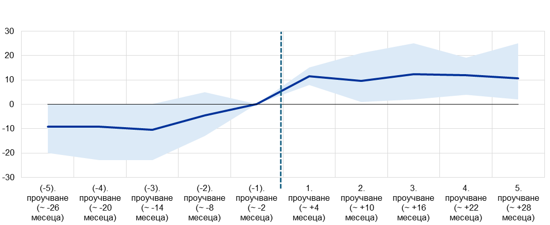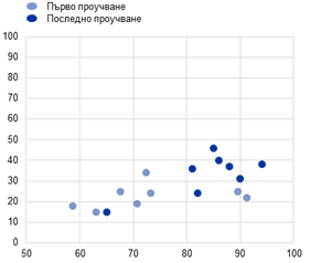 Забележки: В проучването на Европейската комисия Standard Eurobarometer, което се провежда два пъти в годината, на гражданите се задава ясно формулиран въпрос: дали са „за“ или „против“ европейски икономически и паричен съюз с единна валута – еврото. Разгледахме как във всяка държава делът на гласовете „за“ еврото се променя преди и след приемането му. За целта използвахме последното проучване преди приемането като отправна точка (посочено като 0 в графиката). Първият въпрос към респондентите на проучването Standard Eurobarometer през пролетта на 2000 г. се отнася за подкрепата им за еврото. В този момент 11 от 12 държави, въвеждащи еврото в обращение през 2002 г., вече официално са приели валутата през 1999 г. Кумулативната промяна в подкрепата за еврото се изчислява като средноаритметична стойност в осемте присъединяващи се държави и се представя според съответния брой отговори в проучването, което се отнася за датата на присъединяване на съответната държава. Кумулативната промяна се посочва като нула в последното проучване преди приемането. Точното време, когато се провеждат проучванията Standard Eurobarometer, леко варира през годините, особено по време на пандемията от Covid-19. Обикновено проучвания, които се провеждат два пъти годишно, имат пролетно издание (около периода от март до май, т.е. приблизително 4 месеца след края на годината) и есенно издание (около периода от септември до ноември, близо два месеца преди края на годината). За да се синхронизира визуализацията на данните от различните държави, на абсцисата в Графика 1 са посочени промените в броя на отговорите в проучването. Броят месеци в скоби има единствено указателна цел и може да бъде по-висок или по-нисък в различните държави. Последните данни са за есента на 2024 г. (пето проучване след приемането на еврото в Хърватия). Тъй като в Словения въпросът е зададен за първи път през есента на 2004 г., първата промяна в подкрепата за еврото там е от четвъртото проучване преди присъединяването. Интервалът около кривата на доверието показва минималните и максималните стойности.