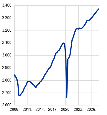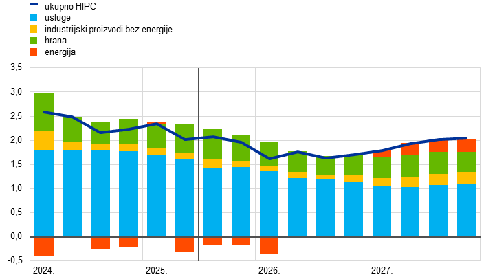 Inflacijski izgledi u skladu su sa stabiliziranjem inflacije na razinama oko srednjoročnog cilja od 2 %. Predviđa se da će ukupna inflacija mjerena harmoniziranim indeksom potrošačkih cijena (HIPC) uglavnom ostati nepromijenjena i iznositi oko 2 % u preostalom dijelu 2025. te da će se potom smanjiti na 1,7 % u 2026. i porasti na 1,9 % u 2027. Smanjenje u 2026. upućuje na daljnje postupno smanjenje komponenata inflacije bez energije. Inflacija cijena energije trebala bi pak i nadalje biti kolebljiva, ali porasti tijekom projekcijskog razdoblja, djelomično zbog uvođenja sustava EU‑a za trgovanje emisijama (ETS2) u 2027. Očekuje se da će inflacija cijena hrane u početku ostati povišena zbog prijenosa odgođenih učinaka prošlih povećanja međunarodnih cijena prehrambenih sirovina, ali da će se u 2026. i 2027. smanjiti na razine malo više od 2 %. Inflacija mjerena HIPC‑om bez energije i hrane trebala bi se smanjiti kako budu popuštali pritisci plaća i smanjivala se inflacija cijena usluga te kako se aprecijacija eura bude prenosila kroz cjenovni lanac i ograničavala inflaciju cijena dobara. Očekuje se da će manji rast plaća, kao posljedica nadoknađivanja prošlog pada realnih plaća, zajedno s oporavkom rasta produktivnosti znatno usporiti rast jediničnih troškova rada. U odnosu na projekcije iz lipnja 2025. izgledi za ukupnu inflaciju mjerenu HIPC‑om revidirani su naviše za 0,1 postotni bod za 2025. i 2026. zbog viših stvarnih i pretpostavljenih cijena energenata te zbog odgođenih učinaka viših međunarodnih cijena prehrambenih sirovina, koji više nego neutraliziraju aprecijaciju eura. Kada je riječ o 2027., predviđa se da će prevladavati odgođeni učinci aprecijacije eura, zbog čega je došlo do revizije naniže za 0,1 postotni bod.