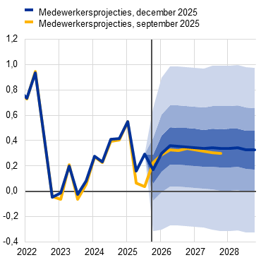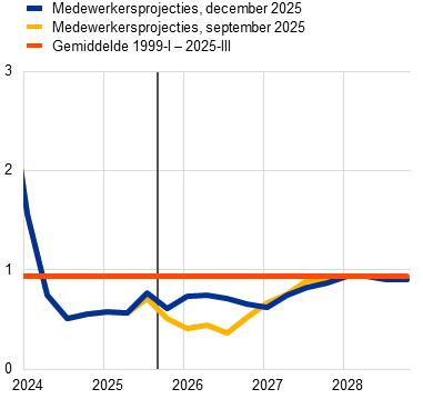 De economie van het eurogebied geeft blijk van veerkracht in een uitdagende mondiale omgeving. Het reële bbp steeg in het derde kwartaal van 2025 met 0,3%, wat hoger was dan in de projecties van september werd voorzien. Dit volgde op volatiele ontwikkelingen in de eerste helft van het jaar, te wijten aan het vervroegd uitvoeren van orders (frontloading) in reactie op hogere Amerikaanse invoerheffingen en de onzekerheid daaromtrent, alsook aan sterke schommelingen in de Ierse gegevens. De binnenlandse vraag zou de belangrijkste stuwende kracht achter de groei in het eurogebied moeten blijven, ondersteund door de stijging van de reële lonen en de werkgelegenheid, tegen de achtergrond van veerkrachtige arbeidsmarkten met historisch lage werkloosheidscijfers. Ook de dit jaar aangekondigde extra overheidsuitgaven voor infrastructuur en defensie, met name in Duitsland, samen met de verbeterde financieringsvoorwaarden als gevolg van de verlagingen van de monetairbeleidsrente sinds juni 2024, zullen de binnenlandse economie naar verwachting ondersteunen. Wat betreft externe factoren wordt verwacht dat de uitvoer volgend jaar zal aantrekken, hoewel de uitdagingen op het gebied van het concurrentievermogen blijven bestaan, waaronder sommige van structurele aard. Deze verbetering is toe te schrijven aan een opleving van de buitenlandse vraag door de afnemende onzekerheid over het handelsbeleid, ondanks het geleidelijk groter wordend effect van de hogere invoerheffingen. De gemiddelde reële bbp-groei op jaarbasis komt volgens de projecties uit op 1,4% in 2025, 1,2% in 2026 en 1,4% in zowel 2027 als 2028. Ten opzichte van de projecties van september 2025 is de bbp-groei voor de gehele projectieperiode opwaarts bijgesteld als gevolg van meevallende gegevens, verminderde handelsonzekerheid, een sterkere buitenlandse vraag en lagere prijzen van energiegrondstoffen.[1]