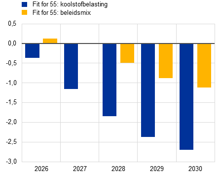 21. De reductie is gelijk aan het verschil tussen de geraamde reductie en de Fit for 55-doelstelling voor 2030 (zie Grafiek C, paneel a)), maar voor het eurogebied en exclusief emissiecompensatie.
