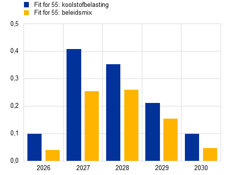 16. In de basisprojecties zijn geen andere EU-maatregelen opgenomen die deel uitmaken van het ‘Fit for 55’-pakket, aangezien de effecten daarvan niet werden geraamd of verwaarloosbaar bleken. Dit stemt overeen met de economische najaarsprognose 2025 van de Europese Commissie, waarin sprake is van een verwaarloosbaar effect van het grenscorrectiemechanisme voor koolstof op de inflatie op korte termijn.