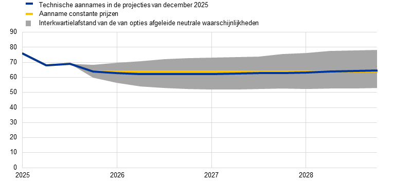 Wat de technische aannames betreft, zijn de veranderingen ten opzichte van de projecties van september al met al beperkt, met uitzondering van de aannames voor de energie- en ETS-prijzen. De aannames voor de olieprijs zijn voor 2026-2027 met gemiddeld ongeveer 4% neerwaarts bijgesteld en die voor de groothandelsprijzen voor gas met 8,6%, terwijl de op futures gebaseerde aanname voor de prijs van ETS1-emissierechten aanzienlijk is gestegen en wel met ongeveer 15%. Na recente aankondigingen wordt er nu vanuit gegaan dat de invoering van de ETS2-regeling met één jaar wordt uitgesteld tot 2028. De prijsaanname is gebaseerd op de prijs die de Europese Commissie in haar najaarsprognose 2025 heeft gebruikt (€ 46 per ton CO2, wat aanzienlijk lager is dan de prijs van € 59 per ton CO2 waarvan voor 2027 werd uitgegaan in de vorige projecties van het Eurosysteem/de ECB; zie Kader 2 voor meer informatie).[6] De euro is sinds de projecties van september met 0,5% in waarde gedaald ten opzichte van de Amerikaanse dollar en met 0,1% in nominaal-effectieve termen. De aannames voor de kortetermijnrente zijn slechts marginaal herzien, terwijl de aannames voor de langetermijnrente voor zowel 2026 als 2027 met 0,2 procentpunt neerwaarts zijn bijgesteld.