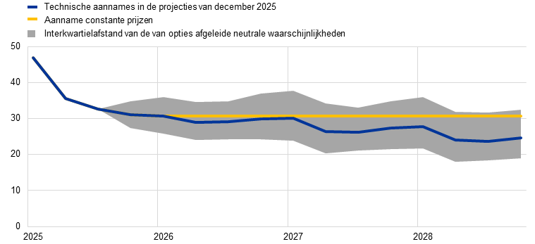 Toelichting: In deze gevoeligheidsanalyse wordt gebruikgemaakt van een synthetische energieprijsindex, waarbij de termijnprijzen van olie en gas worden gecombineerd. Het 25e en het 75e percentiel hebben betrekking op de van opties afgeleide neutrale waarschijnlijkheden voor de olie- en gasprijzen op 26 november 2025. De constante olie- en gasprijzen zijn per dezelfde datum. De macro-economische effecten worden gerapporteerd als gemiddelden van een aantal macro-economische modellen van medewerkers van de ECB en het Eurosysteem.