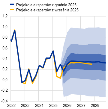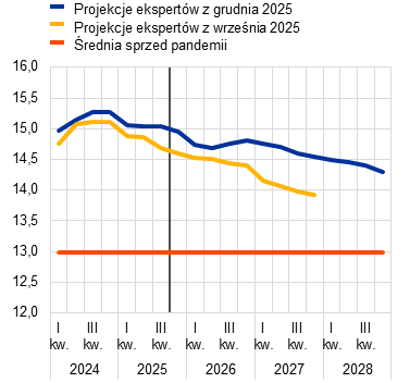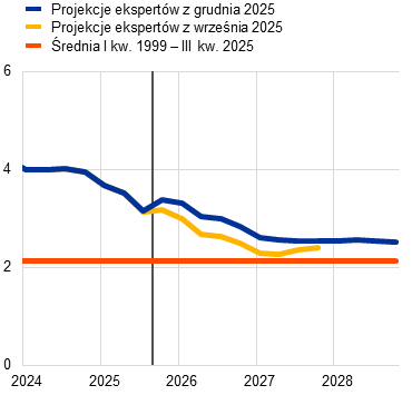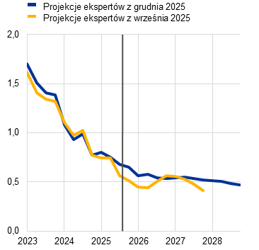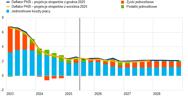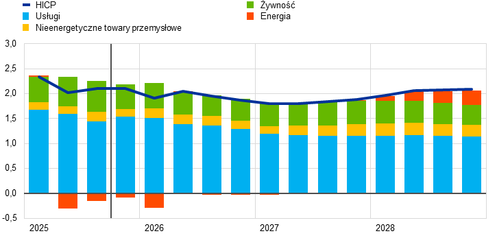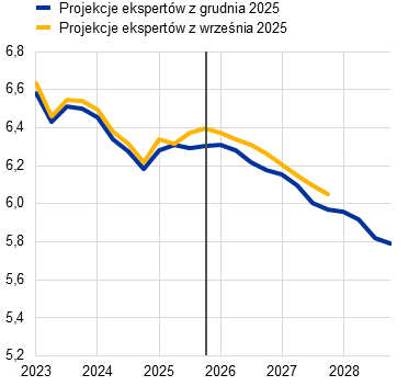Inflacja według projekcji spadnie z 2,1% w 2025 do 1,9% w 2026, a następnie do 1,8% w 2027, po czym w 2028 wzrośnie do poziomu średniookresowego celu EBC wynoszącego 2%. Oczekiwany spadek inflacji ogółem (mierzonej zharmonizowanym wskaźnikiem cen konsumpcyjnych – HICP) na początku 2026 jest odzwierciedleniem ujemnego efektu bazy wynikającego z cen energii, podczas gdy inflacja składowych nieenergetycznych powinna dalej słabnąć przez cały 2026. Według przewidywań kontrybucja inflacji cen energii do inflacji ogółem pozostanie niewielka aż do ostatnich miesięcy 2027, po czym wyraźnie zwiększy się w 2028 w związku z oczekiwanym wdrożeniem unijnego systemu handlu uprawnieniami do emisji 2 (ETS2), którego wzrostowe oddziaływanie na inflację ogółem wyniesie 0,2 pkt proc. Oczekuje się, że inflacja HICP z wyłączeniem cen energii spadnie z 2,5% w 2025 do 2,2% w 2026 i 2,0% w latach 2027 i 2028. Inflacja cen żywności według projekcji znacznie się obniży w miarę słabnięcia wpływu wcześniejszego wzrostu cen surowców żywnościowych na świecie i niekorzystnych warunków pogodowych w okresie letnim, a od końca 2026 ustabilizuje się na poziomie nieco powyżej 2%. Inflacja HICP z wyłączeniem cen energii i żywności (HICPX) ma się zmniejszać – z 2,4% w 2025 do 2,0% w 2028 – w miarę jak inflacja cen usług będzie słabnąć przy ustępowaniu presji związanej z kosztami pracy, a wcześniejsza aprecjacja euro oddziaływać w łańcuchu cenowym i ograniczać inflację cen towarów. Dynamika płac powinna nadal się obniżać w 2026, a następnie ustabilizować się na poziomie około 3%, czemu sprzyjać będzie odporność rynku pracy i wzrost produktywności wynoszący nieco poniżej 1%. Dynamika jednostkowych kosztów pracy według oczekiwań będzie się obniżać, choć odnośny wpływ na inflację ma być częściowo równoważony przez stopniowy wzrost marż zysku w horyzoncie projekcji. W porównaniu z projekcjami z września 2025 perspektywy inflacji HICP ogółem na 2026 zrewidowano w górę o 0,2 pkt proc., co wynika z niedawnych zaskakujących danych dotyczących inflacji HICP i wzrostu płac. Dane o dynamice płac doprowadziły do znacznej rewizji w górę perspektyw płac. Projekcja inflacji HICP na 2027 została zrewidowana nieco w dół ze względu na zakładaną niższą kontrybucję inflacji cen energii (jako że wdrożenie systemu ETS2 ma zostać przełożone z 2027 na 2028), choć tę kontrybucję powinna częściowo zrównoważyć wyższa inflacja cen usług.