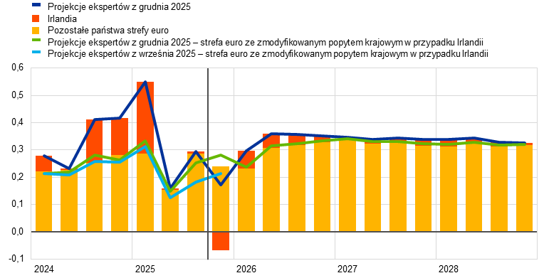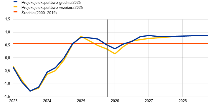 Gospodarka strefy euro wykazuje odporność mimo trudnego otoczenia globalnego. Realny PKB w trzecim kwartale 2025 wzrósł o 0,3%, czyli więcej, niż przewidywano w projekcjach wrześniowych. Było to następstwem niestabilnej trajektorii w pierwszym półroczu, odzwierciedlającej wpływ przyspieszenia aktywności w reakcji na wyższe cła handlowe w USA i związaną z tym niepewność, a także oddziaływanie mocnych wahań danych dla Irlandii. Motorem wzrostu gospodarczego w strefie euro powinien pozostać popyt wewnętrzny, wzmacniany przez rosnące płace realne i zatrudnienie, przy odpornych rynkach pracy i rekordowo niskich stopach bezrobocia. Oczekuje się, że gospodarkę strefy euro będą też wspierać ogłoszone w tym roku dodatkowe wydatki publiczne na infrastrukturę i obronność, zwłaszcza w Niemczech, oraz poprawa warunków finansowania wynikająca z obniżek stóp procentowych wprowadzonych od czerwca 2024. Jeśli chodzi o czynniki zewnętrzne, utrzymują się wprawdzie wyzwania w zakresie konkurencyjności, w tym pewne problemy o charakterze strukturalnym, ale według oczekiwań eksport w przyszłym roku wzrośnie. Ta poprawa ma wynikać z odbicia popytu zewnętrznego w obliczu spadku niepewności związanej z polityką handlową, mimo stopniowo uwidaczniającego się wpływu wyższych ceł. Przewiduje się, że średnioroczna dynamika realnego PKB wyniesie 1,4% w 2025, 1,2% w 2026, 1,4% w 2027 i 1,4% w 2028. W porównaniu z projekcjami z września 2025 dynamika PKB w całym horyzoncie projekcji została zrewidowana w górę w związku z lepszymi, niż oczekiwano, danymi, mniejszą niepewnością co do polityki handlowej, silniejszym popytem zewnętrznym i niższymi cenami surowców energetycznych[1].