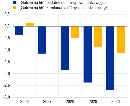 16. W scenariuszu bazowym projekcji nie uwzględniono skutków żadnych dalszych unijnych środków objętych pakietem „Gotowi na 55”, ponieważ ich wpływ nie został oszacowany albo uznano go za znikomy. Jest to spójne z prognozą gospodarczą Komisji Europejskiej „European Economic Forecast. Autumn 2025”, w której oszacowano, że mechanizm dostosowywania cen na granicach z uwzględnieniem emisji CO2 ma znikomy wpływ na inflację w krótkim okresie.