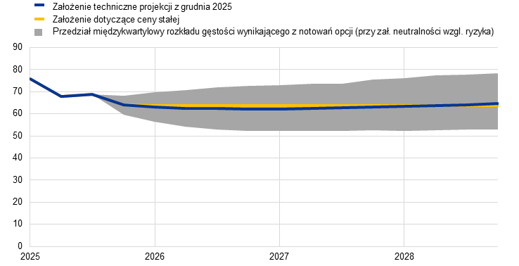 Uwagi: W niniejszej analizie wrażliwości stosuje się syntetyczny indeks cen energii, który obejmuje ceny terminowe ropy i gazu. 25. percentyl i 75. percentyl odnoszą się do rozkładu gęstości cen ropy i gazu wynikającego z notowań opcji (przy założeniu neutralności względem ryzyka) na 26 listopada 2025. Stałe ceny ropy i gazu również opierają się na wartościach z tego dnia. Skutki makroekonomiczne podaje się jako średnie wyników uzyskanych z różnych modeli makroekonomicznych stosowanych przez ekspertów EBC i Eurosystemu.