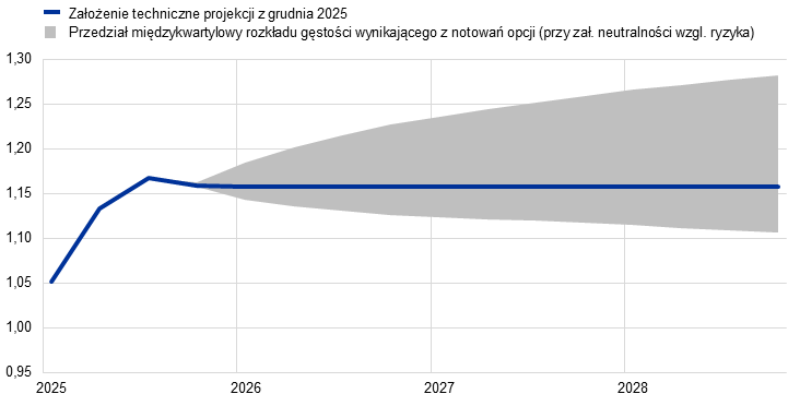 Uwagi: Wzrost oznacza aprecjację euro. 25. percentyl i 75. percentyl odnoszą się do rozkładu gęstości kursu USD/EUR wynikającego z notowań opcji (przy założeniu neutralności względem ryzyka) na 26 listopada 2025. Skutki makroekonomiczne podaje się jako średnie wyników uzyskanych z różnych modeli makroekonomicznych stosowanych przez ekspertów EBC i Eurosystemu.