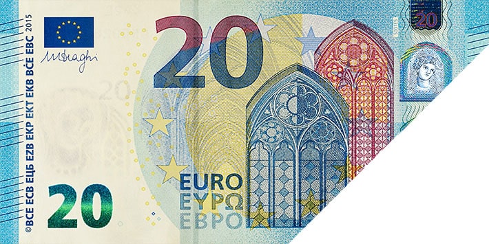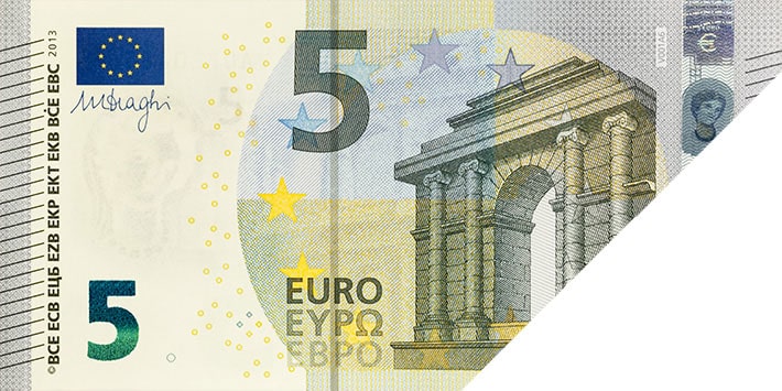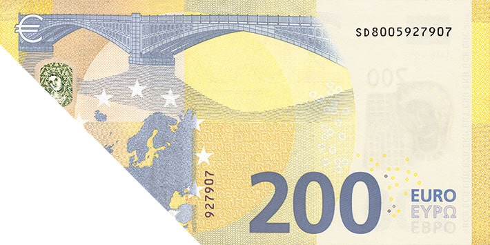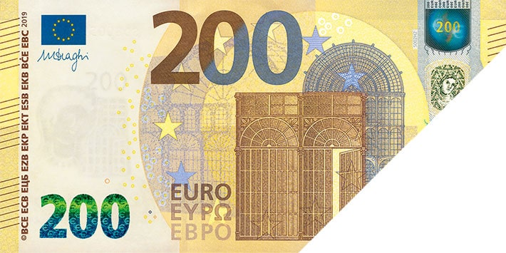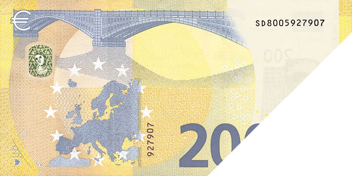 Tilt the banknote. The shiny number in the bottom-left corner changes colour from emerald green to deep blue and displays an effect of the light that moves up and down. The new €100 and €200 banknotes also show tiny € symbols inside the number.