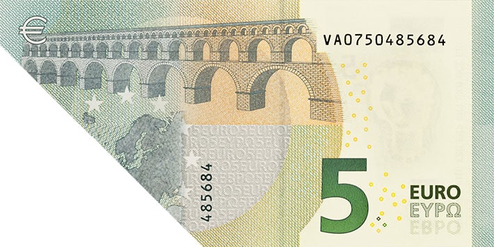 The €5 banknote shows classical-style (Greek and Roman) architecture from the 8th century BC to the 4th century AD.