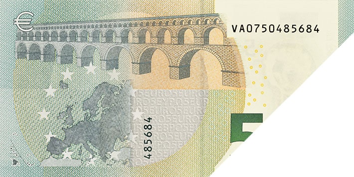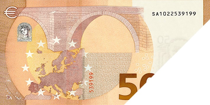 Hold the banknote against the light. An image of Europa, a copy of the main image and the value of the banknote appear on the left.