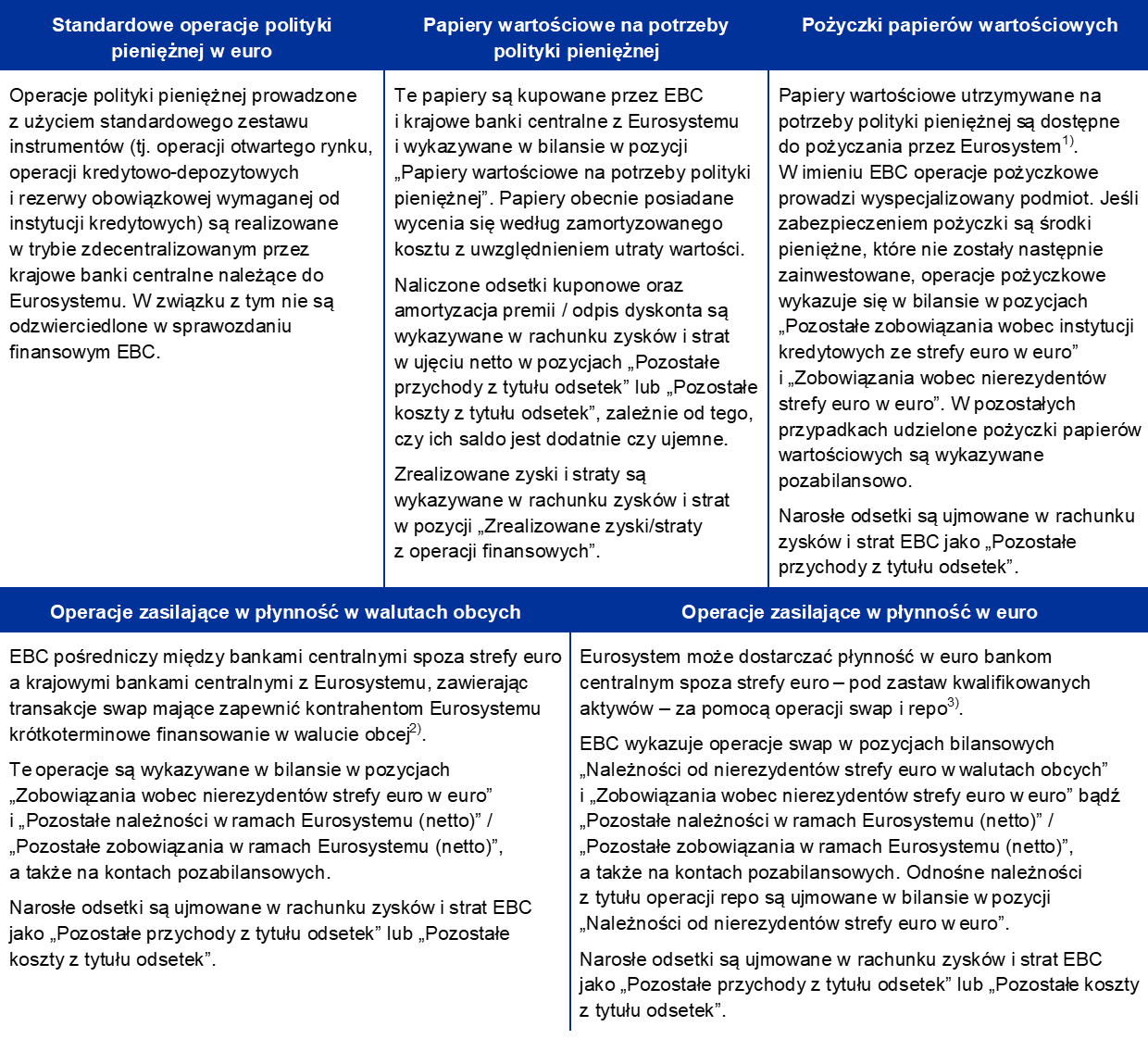 Operacje polityki pieniężnej Eurosystemu są ujmowane w sprawozdaniach finansowych EBC i krajowych banków centralnych ze strefy euro, zgodnie z zasadą zdecentralizowanej realizacji polityki pieniężnej w Eurosystemie. Tabela 1 przedstawia główne operacje i funkcje realizowane przez EBC w ramach jego mandatu oraz ich wpływ na sprawozdanie finansowe.