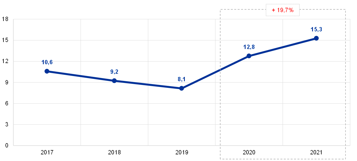 Łączna wartość banknotów euro w obiegu na koniec 2021 wyniosła 1544,4 mld EUR, co oznacza wzrost o 8% w porównaniu ze stanem na koniec 2020. EBC ma 8‑procentowy udział w łącznej wartości banknotów euro w obiegu. Wartość tego udziału na koniec roku wyniosła 123,6 mld EUR. Ponieważ sam EBC nie emituje banknotów, wykazuje należności w ramach Eurosystemu od krajowych banków centralnych ze strefy euro w kwocie odpowiadającej wartości banknotów w obiegu.