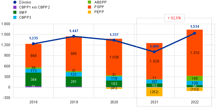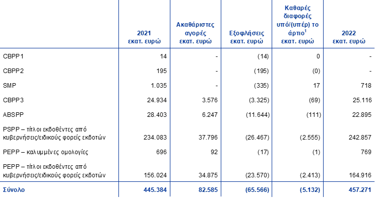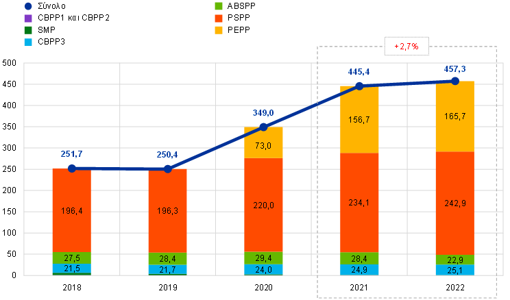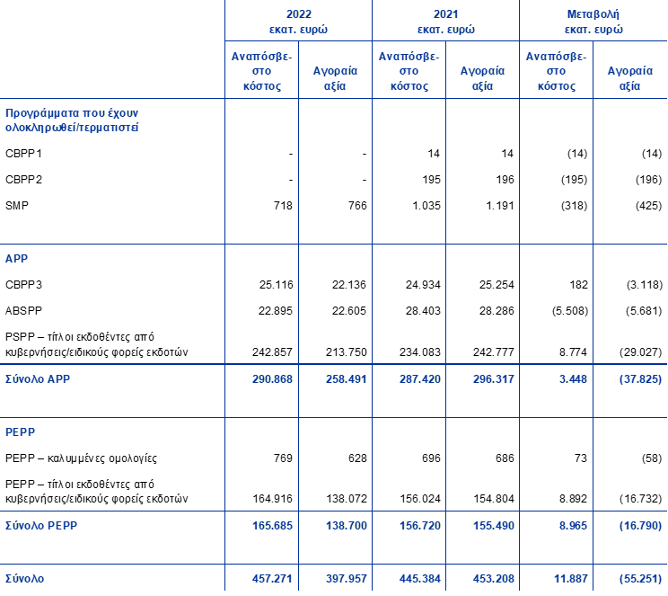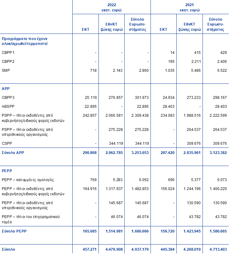 Με βάση τις σχετικές αποφάσεις του Διοικητικού Συμβουλίου, η ΕΚΤ συνέχισε να διενεργεί καθαρές αγορές τίτλων στο πλαίσιο του προγράμματος PEPP μέχρι το τέλος Μαρτίου του 2022, ενώ οι καθαρές αγορές που διενεργούνταν στο πλαίσιο του προγράμματος APP έληξαν την 1η Ιουλίου 2022. Ταυτόχρονα, στη διάρκεια του έτους συνεχίστηκε η πλήρης επανεπένδυση των ποσών κεφαλαίου από την εξόφληση τίτλων κατά τη λήξη τους που διακρατούνταν και στα δύο χαρτοφυλάκια. Ως αποτέλεσμα αυτών των αγορών και επανεπενδύσεων, το χαρτοφυλάκιο τίτλων που διακρατεί η ΕΚΤ για σκοπούς νομισματικής πολιτικής αυξήθηκε κατά 11,9 δισεκ. ευρώ σε 457,3 δισεκ. ευρώ (Διάγραμμα 2), καθώς αυξήθηκαν οι τίτλοι που διακρατούνται στο πλαίσιο των προγραμμάτων PEPP και PSPP κατά 9,0 δισεκ. ευρώ και 8,8 δισεκ. ευρώ αντίστοιχα. Η μείωση κατά 5,5 δισεκ. ευρώ των τίτλων που διακρατούνται στο πλαίσιο του προγράμματος ABSPP οφείλεται σε εξοφλήσεις.