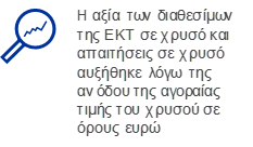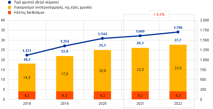 Το ισότιμο σε ευρώ της αξίας των διαθεσίμων της ΕΚΤ σε χρυσό και απαιτήσεις σε χρυσό αυξήθηκε κατά 1,6 δισεκ. ευρώ σε 27,7 δισεκ. ευρώ το 2022 (Διάγραμμα 4), λόγω της ανόδου της αγοραίας τιμής του χρυσού σε όρους ευρώ, ενώ το ύψος των εν λόγω διαθεσίμων σε ουγγιές καθαρού χρυσού παρέμεινε αμετάβλητο. Αυτή η άνοδος οδήγησε επίσης σε ισόποση αύξηση των λογαριασμών αναπροσαρμογής της αξίας χρυσού της ΕΚΤ (βλ. Ενότητα 1.3.2 "Οικονομικοί πόροι").