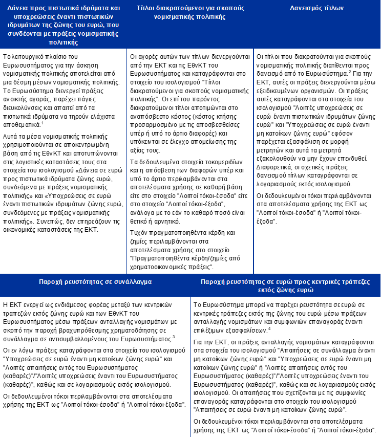 Οι πράξεις νομισματικής πολιτικής του Ευρωσυστήματος καταγράφονται στις οικονομικές καταστάσεις της ΕΚΤ και των ΕθνΚΤ της ζώνης του ευρώ, αντανακλώντας την αρχή της αποκεντρωμένης εφαρμογής της νομισματικής πολιτικής στο Ευρωσύστημα. Ο Πίνακας 1 παρακάτω παρουσιάζει συνοπτικά τις κύριες πράξεις και τα βασικά καθήκοντα της ΕΚΤ κατά την εκπλήρωση της αποστολής της καθώς και την επίδρασή τους στις οικονομικές καταστάσεις της ΕΚΤ.