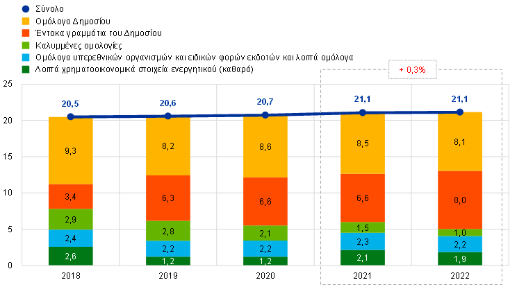Σημείωση: Για λόγους συγκρισιμότητας, τα ποσά που εμφανίζονται στα επιμέρους στοιχεία "Γενική κυβέρνηση" και "Λοιπές υποχρεώσεις" υπό το στοιχείο "Υποχρεώσεις σε ευρώ έναντι λοιπών κατοίκων ζώνης ευρώ" προσαρμόστηκαν για το 2018 και το 2019 σύμφωνα με την προσέγγιση που εφαρμόζεται από το 2020. Περισσότερες λεπτομέρειες σχετικά με αυτή τη μεταβολή διατίθενται στην ενότητα 2.3 "Λογιστικές πολιτικές" ("Αναταξινομήσεις") των Ετήσιων Λογαριασμών της ΕΚΤ για το 2020.