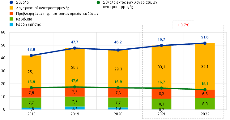 Σημείωση: Οι "Λογαριασμοί αναπροσαρμογής" περιλαμβάνουν τα συνολικά κέρδη από αναπροσαρμογή όσον αφορά τον χρυσό, τα συναλλαγματικά διαθέσιμα και τους διακρατούμενους τίτλους, όχι όμως τους λογαριασμούς αναπροσαρμογής όσον αφορά τις μετεργασιακές παροχές.