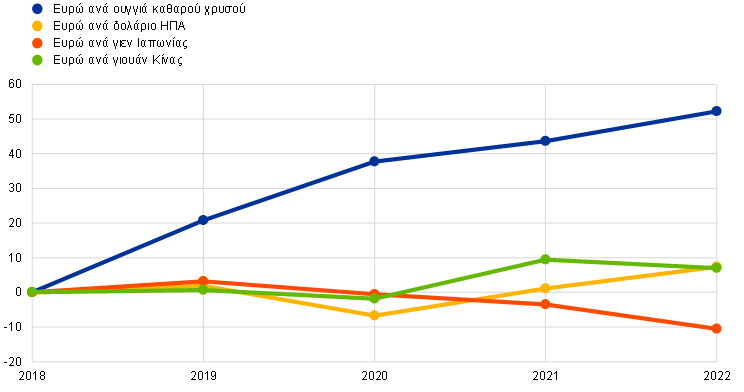 Οι βασικές συναλλαγματικές ισοτιμίες και η τιμή του χρυσού κατά την περίοδο 2018-22