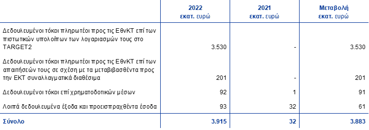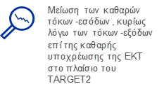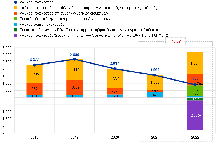 Οι καθαροί τόκοι-έσοδα της ΕΚΤ μειώθηκαν κατά 666 εκατ. ευρώ σε 900 εκατ. ευρώ (Διάγραμμα 14), κυρίως λόγω των τόκων-εξόδων επί της καθαρής υποχρέωσης της ΕΚΤ στο πλαίσιο του TARGET2. Οι τόκοι-έξοδα επί των τόκων απαιτήσεων των ΕθνΚΤ της ζώνης του ευρώ σε σχέση με τα συναλλαγματικά διαθέσιμα που μεταβιβάστηκαν στην ΕΚΤ συνέβαλαν επίσης στη μείωση αυτή. Αυτοί οι τόκοι-έξοδα αντισταθμίστηκαν εν μέρει από την αύξηση των τόκων-εσόδων που προέκυψε από (i) τις απαιτήσεις της ΕΚΤ που συνδέονται με την κατανομή των τραπεζογραμματίων ευρώ εντός του Ευρωσυστήματος, (ii) τα συναλλαγματικά διαθέσιμα και (iii) τους τίτλους που διακρατούνται για σκοπούς νομισματικής πολιτικής.