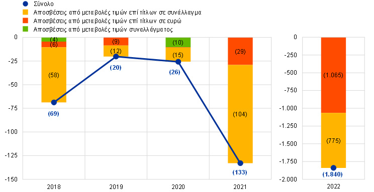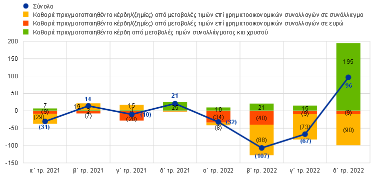 Μη πραγματοποιηθέντα κέρδη από χρυσό και συνάλλαγμα και μη πραγματοποιηθέντα κέρδη από τίτλους που υπόκεινται σε αναπροσαρμογή λόγω μεταβολής των τιμών δεν αναγνωρίζονται ως έσοδα στα αποτελέσματα χρήσης αλλά καταγράφονται απευθείας στους λογαριασμούς αναπροσαρμογής που εμφανίζονται στο παθητικό του ισολογισμού της ΕΚΤ. Τα υπόλοιπα των εν λόγω λογαριασμών μπορούν να χρησιμοποιηθούν για να απορροφήσουν την επίδραση τυχόν μελλοντικών δυσμενών μεταβολών των αντίστοιχων τιμών ή/και συναλλαγματικών ισοτιμιών, ενισχύοντας έτσι την ανθεκτικότητα της ΕΚΤ έναντι των υποκείμενων κινδύνων. Το 2022 οι λογαριασμοί αναπροσαρμογής όσον αφορά τον χρυσό, το συνάλλαγμα και τους τίτλους[14] αυξήθηκαν κατά 3,0 δισεκ. ευρώ σε 36,1 δισεκ. ευρώ, λόγω των μεγαλύτερων διαφορών αναπροσαρμογής όσον αφορά το συνάλλαγμα και τον χρυσό, κυρίως ως αποτέλεσμα της ανατίμησης του δολαρίου ΗΠΑ έναντι του ευρώ και της αύξησης της αγοραίας τιμής του χρυσού σε όρους ευρώ (Διάγραμμα 12), που αντισταθμίστηκαν εν μέρει από τη μείωση των διαφορών αναπροσαρμογής για τίτλους.