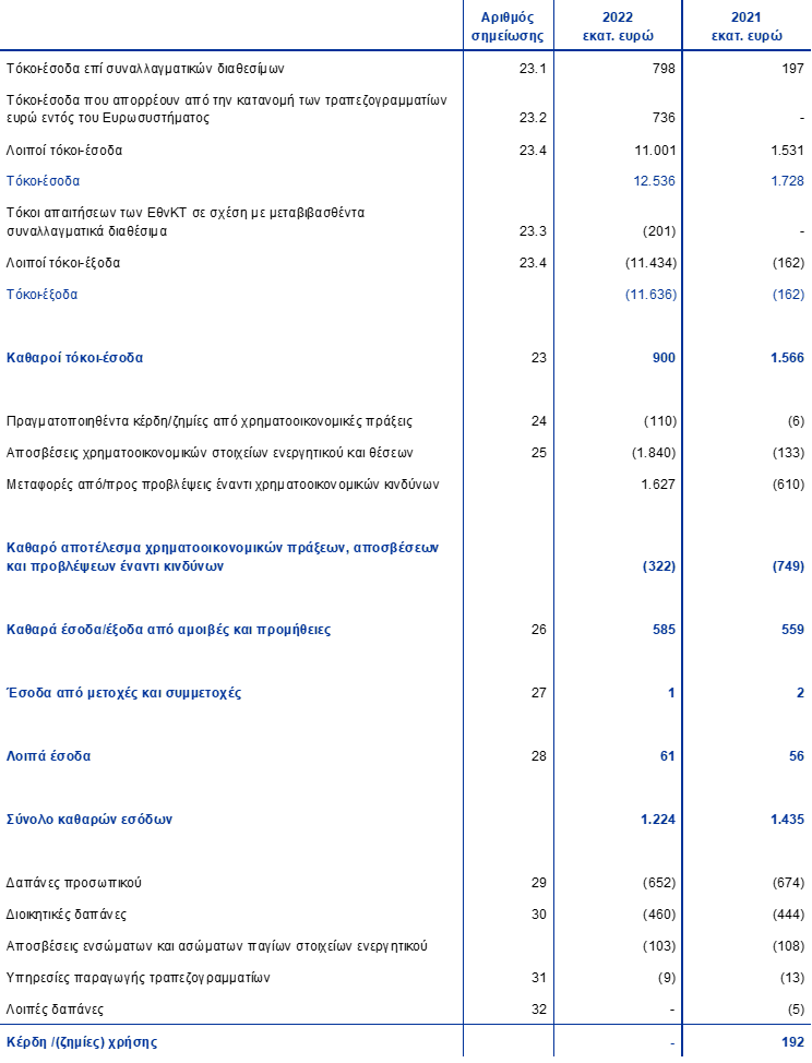 Μετά την αποδέσμευση ποσού ύψους 1.627 εκατ. ευρώ από την πρόβλεψη έναντι χρηματοοικονομικών κινδύνων για την αντιστάθμιση των ζημιών που σημειώθηκαν το 2022, το οικονομικό αποτέλεσμα της ΕΚΤ ήταν μηδενικό (2021: 192 εκατ. ευρώ). Οι ζημίες προήλθαν κυρίως από i) τους τόκους-έξοδα επί της καθαρής υποχρέωσης της ΕΚΤ στο πλαίσιο του TARGET2 και (β) το αρνητικό καθαρό αποτέλεσμα από χρηματοοικονομικές πράξεις και αποσβέσεις (Διάγραμμα 13).