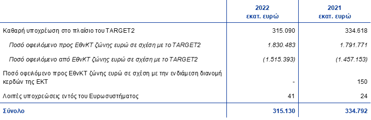 Οι υποχρεώσεις εντός του Ευρωσυστήματος της ΕΚΤ, οι οποίες αποτελούνται κυρίως από το καθαρό υπόλοιπο των ΕθνΚΤ της ζώνης του ευρώ έναντι της ΕΚΤ του TARGET2 και τις υποχρεώσεις της ΕΚΤ όσον αφορά τα συναλλαγματικά διαθέσιμα που μεταβιβάστηκαν σε αυτήν από τις ΕθνΚΤ της ζώνης του ευρώ όταν εντάχθηκαν στο Ευρωσύστημα, μειώθηκαν κατά 19,7 δισεκ. ευρώ σε 355,5 δισεκ. ευρώ το 2022.
