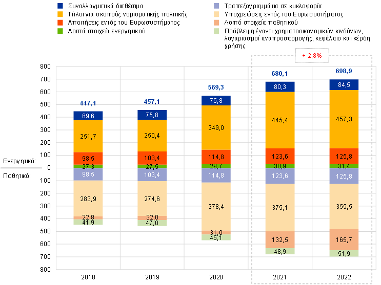 Το 2022 ο ισολογισμός της ΕΚΤ αυξήθηκε κατά 18,7 δισεκ. ευρώ σε 698,9 δισεκ. ευρώ, κυρίως λόγω του μεριδίου της ΕΚΤ όσον αφορά τις αγορές τίτλων που έχουν διενεργηθεί στο πλαίσιο των προγραμμάτων PEPP και APP. Οι αγορές αυτές είχαν ως αποτέλεσμα την αύξηση των τίτλων που διακρατούνται για σκοπούς νομισματικής πολιτικής, ενώ ο διακανονισμός σε μετρητά των εν λόγω αγορών μέσω λογαριασμών στο TARGET2 οδήγησε σε αντίστοιχη αύξηση των υποχρεώσεων εντός του Ευρωσυστήματος. Αυτή η αύξηση των υποχρεώσεων εντός του Ευρωσυστήματος υπεραντισταθμίστηκε από τις εισροές μετρητών λόγω της αύξησης των καταθέσεων που τηρούν κάτοικοι της ζώνης του ευρώ στην ΕΚΤ, με αποτέλεσμα ταυτόχρονη αύξηση των λοιπών υποχρεώσεων.