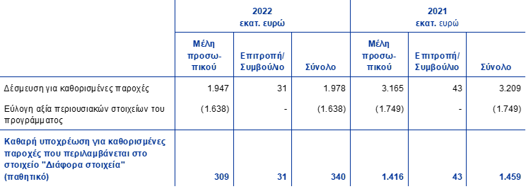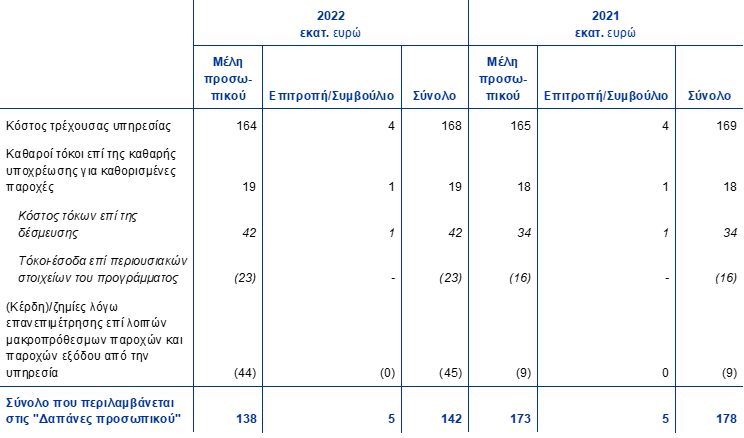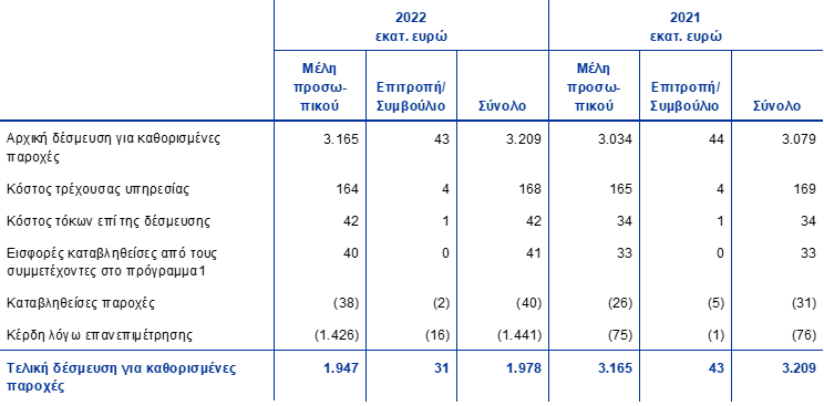 Ο πυλώνας καθορισμένων παροχών του προγράμματος αντικατοπτρίζει μόνο τις υποχρεωτικές εισφορές που καταβάλλουν η ΕΚΤ και τα μέλη του προσωπικού. Επιπλέον, οι εθελούσιες εισφορές μελών του προσωπικού σε πυλώνα καθορισμένων εισφορών το 2022 ανήλθαν σε 189 εκατ. ευρώ (2021: 220 εκατ. ευρώ). Οι εν λόγω εισφορές επενδύονται σε περιουσιακά στοιχεία του προγράμματος και δημιουργούν αντίστοιχη ισόποση δέσμευση.