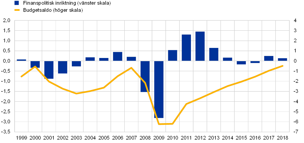 Det övergripande offentliga underskottet i euroområdet fortsatte att minska under 2018 och uppgick till 0,6 procent av BNP – en nivå som sällan har förekommit sedan Ekonomiska och monetära unionen (EMU) infördes 1999 (se diagram 7). Minskningen i det övergripande underskottet berodde precis som tidigare år i stor utsträckning på en gynnsam konjunktur, i kombination med sjunkande ränteutgifter i takt med att dyra lån har förfallit och ersatts med nya lån till lägre ränta. Den finanspolitiska inriktningen i euroområdet[6] var i stort sett neutral under 2018, även om aggregatet för euroområdet dolde betydande skillnader mellan länderna, där stora oväntade överskott i några länder uppvägde konjunkturförstärkande finanspolitiska lättnader i sårbara länder.