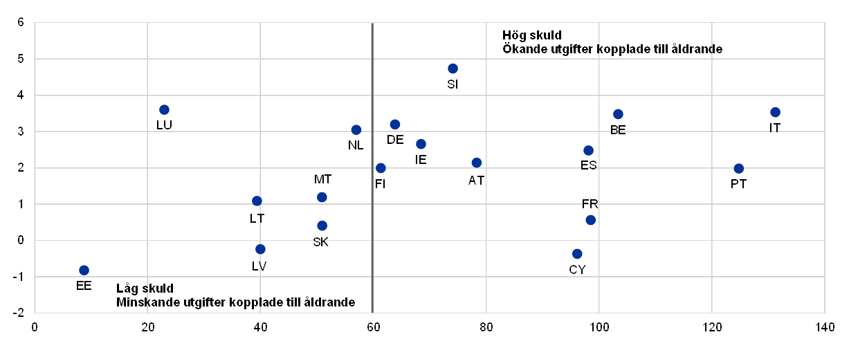 (x-axeln: offentlig skuld i förhållande till BNP 2017; y-axeln: förändringar i de sammanlagda utgifterna kopplade till åldrande som andel av BNP, 2016–2040)