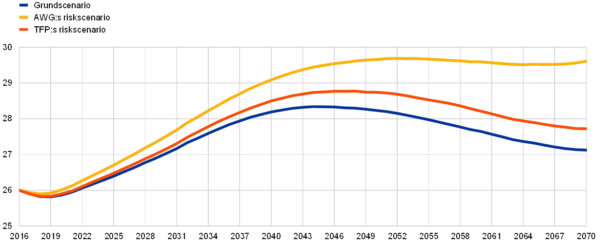 Anm.: I riskscenariot för totalfaktorproduktiviteten förutsätts en konvergens mot en lägre tillväxttakt fram till 2070 (dvs. till 0,8 procent i stället för 1 procent). I riskscenariot från arbetsgruppen för åldrande förutsätts en högre inkomstelasticitet i fråga om hälso- och sjukvårdsutgifterna (till följd av ökad användning av dyr medicinsk teknik) och högre kostnader för långtidsvård (på grund av ökad täckning för mottagare av långtidsvård och en uppåtriktad konvergens i real levnadsstandard).