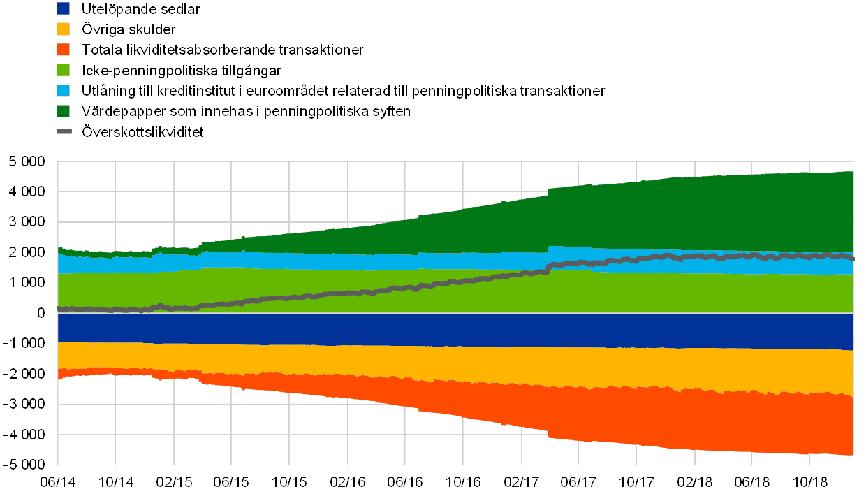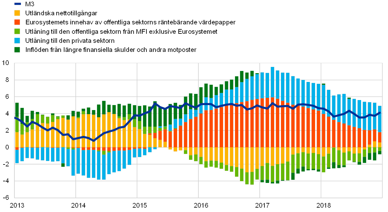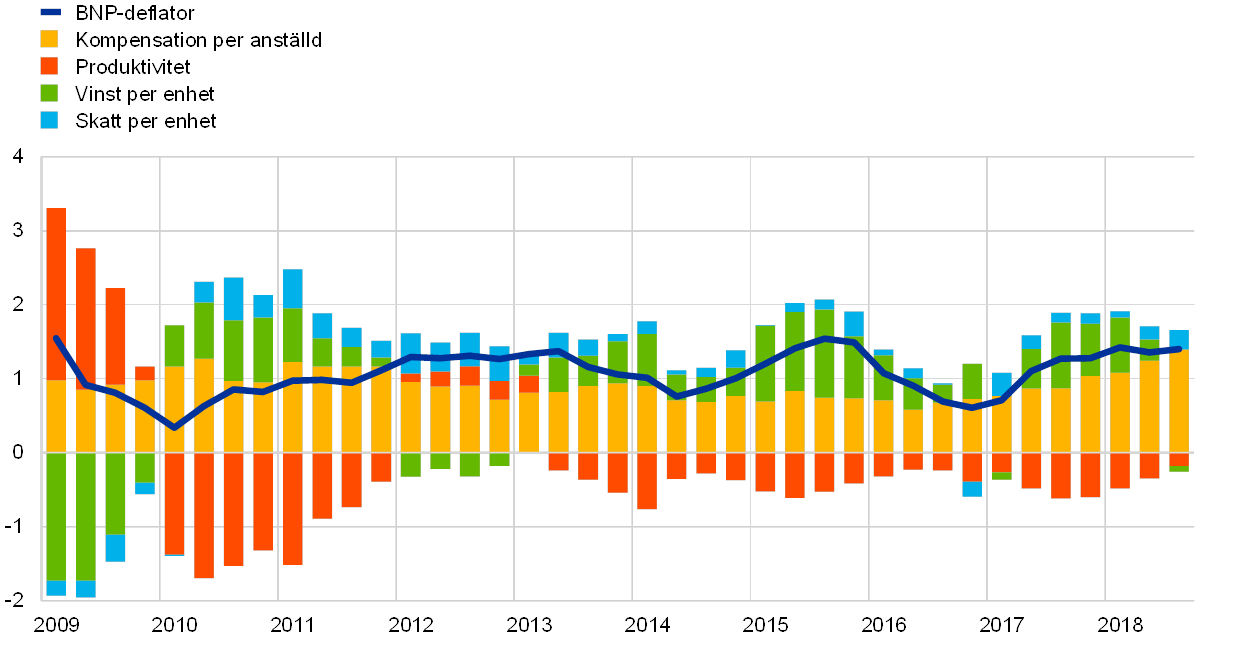 Efter den exceptionellt starka tillväxten under 2017 fortsatte euroområdets ekonomiska expansion under 2018, om än i något måttligare takt, då den externa efterfrågan försvagades och vissa lands- och sektorsspecifika faktorer dämpade tillväxten. Samtidigt kvarstod de underliggande drivkrafterna för den inhemska efterfrågan. Fortsatta förbättringar på arbetsmarknaden bidrog till hushållens konsumtion, medan företagsinvesteringarna fortsatte att gynnas av fördelaktiga finansieringsvillkor och förbättrade balansräkningar. Den pågående expansionen och stramare arbetsmarknader ledde också till en fortsatt förstärkning och utökning av det inhemska kostnadstrycket. Samtidigt var måtten på underliggande inflation generellt fortsatt dämpade. Inför framtiden väntas den underliggande inflationen dock öka på medellång sikt, med stöd av ECB:s penningpolitiska åtgärder, den fortsatta ekonomiska expansionen och ökande lönetillväxten.