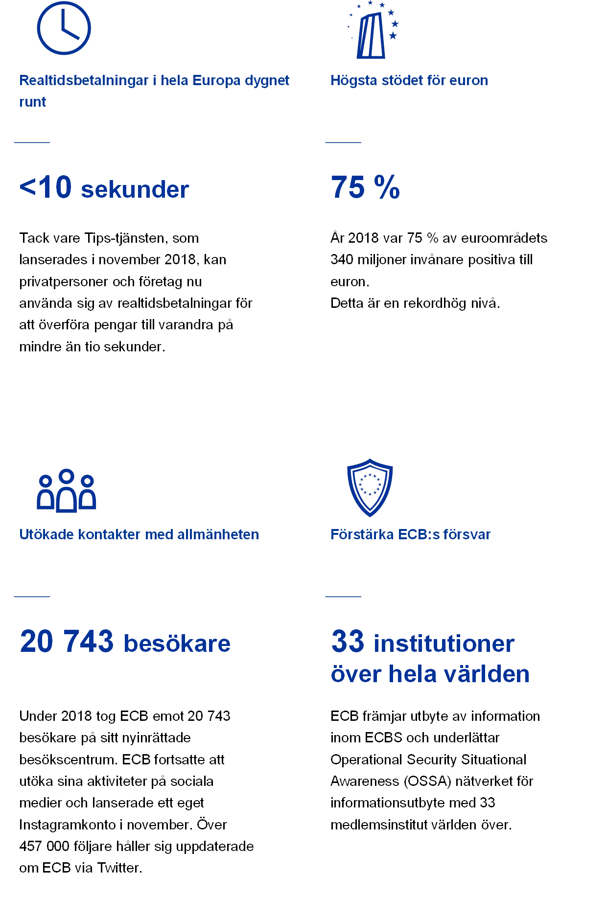 Eurobarometerns decembernummer för 2018 visade att stödet för euron har ökat till 75 procent. ECB fortsatte sina ansträngningar att nå ut till människorna i euroområdet och att öka sin ansvarighet och öppenhet genom att samverka med Europaparlamentet men även med hjälp av initiativet ”Youth Dialogues”, uppmuntra till besök på ECB:s webbplats, sociala medier och ECB:s besökscentrum.