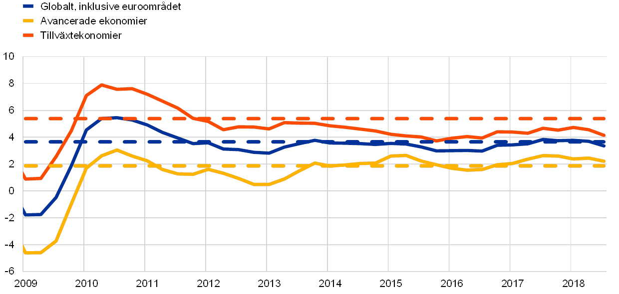 Den globala expansionen fortsatte i en jämn takt på 3,6 procent under de tre första kvartalen 2018, ungefär i samma nivå som föregående år, och ligger nära det långsiktiga genomsnittet (se diagram 1). Jämfört med föregående år blev dock uppgången i den ekonomiska aktiviteten mer ojämn och mindre synkroniserad mellan länderna. Tillväxten var fortsatt stabil i USA, men försvagades i ett antal andra länder, däribland Japan och vissa tillväxtekonomier, särskilt Turkiet och Argentina. Aktiviteten mattades också av i Kina under andra halvåret. Ser vi på olika komponenter försvagades tillväxten i industriproduktion och världshandel, medan tillväxten i hushållens konsumtion var fortsatt stark.