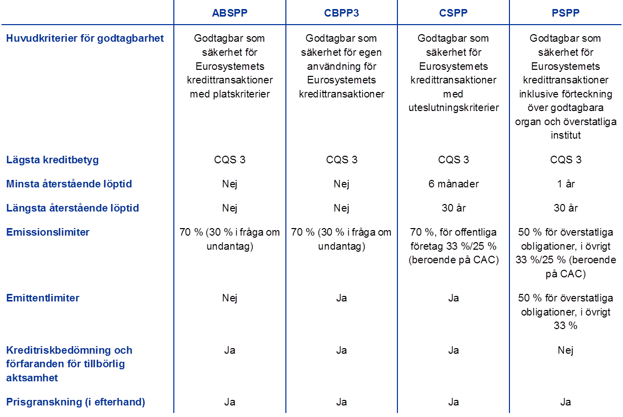 - Den 19 januari 2017 beslutade ECB-rådet att inköp av tillgångar med en avkastning fram till förfallodagen under räntan för inlåningsfaciliteten endast är tillåtna inom ramen för PSPP och bekräftade att inga sådana inköp planeras för CBPP3, ABSPP och CSPP. Läs mer på ECB:s webbplats.