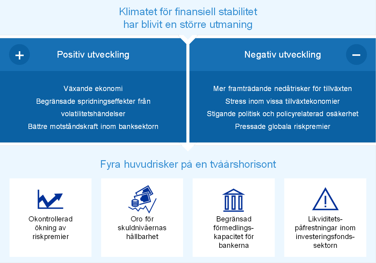 Samtidigt som den globala tillväxten fortsatt i stabil takt har utsikterna blivit alltmer oklara till följd av risker och osäkerheter. Framför allt ökade osäkerheten inom handeln efter vissa åtgärder från den amerikanska administrationens sida och deras handelspartners motåtgärder. Detta kulminerade med två tillkännagivanden från den amerikanska administrationen om tullar på kinesisk export till ett värde av 250 miljarder US-dollar under sommaren och Kinas tillkännagivande om motåtgärder mot export från USA till ett värde av 110 miljarder US-dollar. Handelsutsikterna påverkades också av frågetecknen kring Brexit. De direkta effekterna av dessa tullar bör visserligen vara begränsade på global nivå, men de protektionistiska hoten riskerar att urholka förtroendet, störa de globala värdekedjorna och påverka investeringarna negativt. Detta är i sin tur en nedåtrisk för de globala ekonomiska utsikterna. Vid årets slut fanns det redan tecken på att osäkerheten i handeln hade börjat påverka företagens beteende. Om handelstvisterna eskalerar ytterligare skulle den globala tillväxten kunna försämras kraftigt.