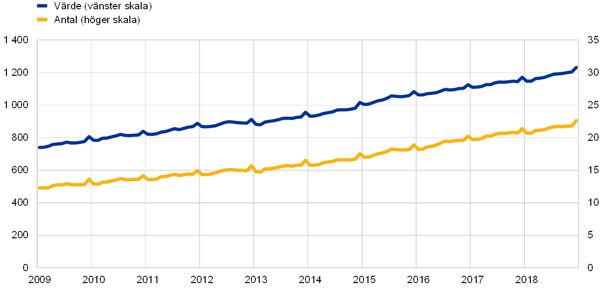 - ECB tar fram statistik över emitterade värdepapper baserat på månadsdata som rapporteras av de nationella centralbankerna i euroområdet. De omfattar uppgifter om utestående belopp, emissioner, återinlösen och tillväxttakt i räntebärande värdepapper och noterade aktier. Uppgifterna delas upp per emissionsland och emissionssektor, typ av instrument, ursprunglig löptid, kupongtyp och valuta. De senast tillgängliga observationerna avser november 2018.
