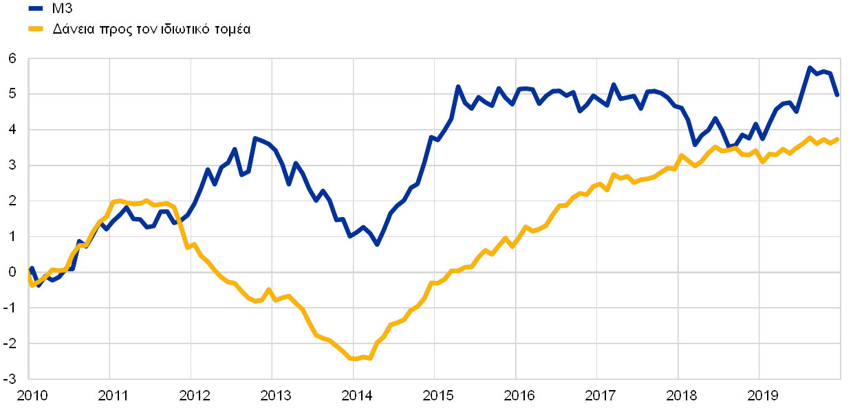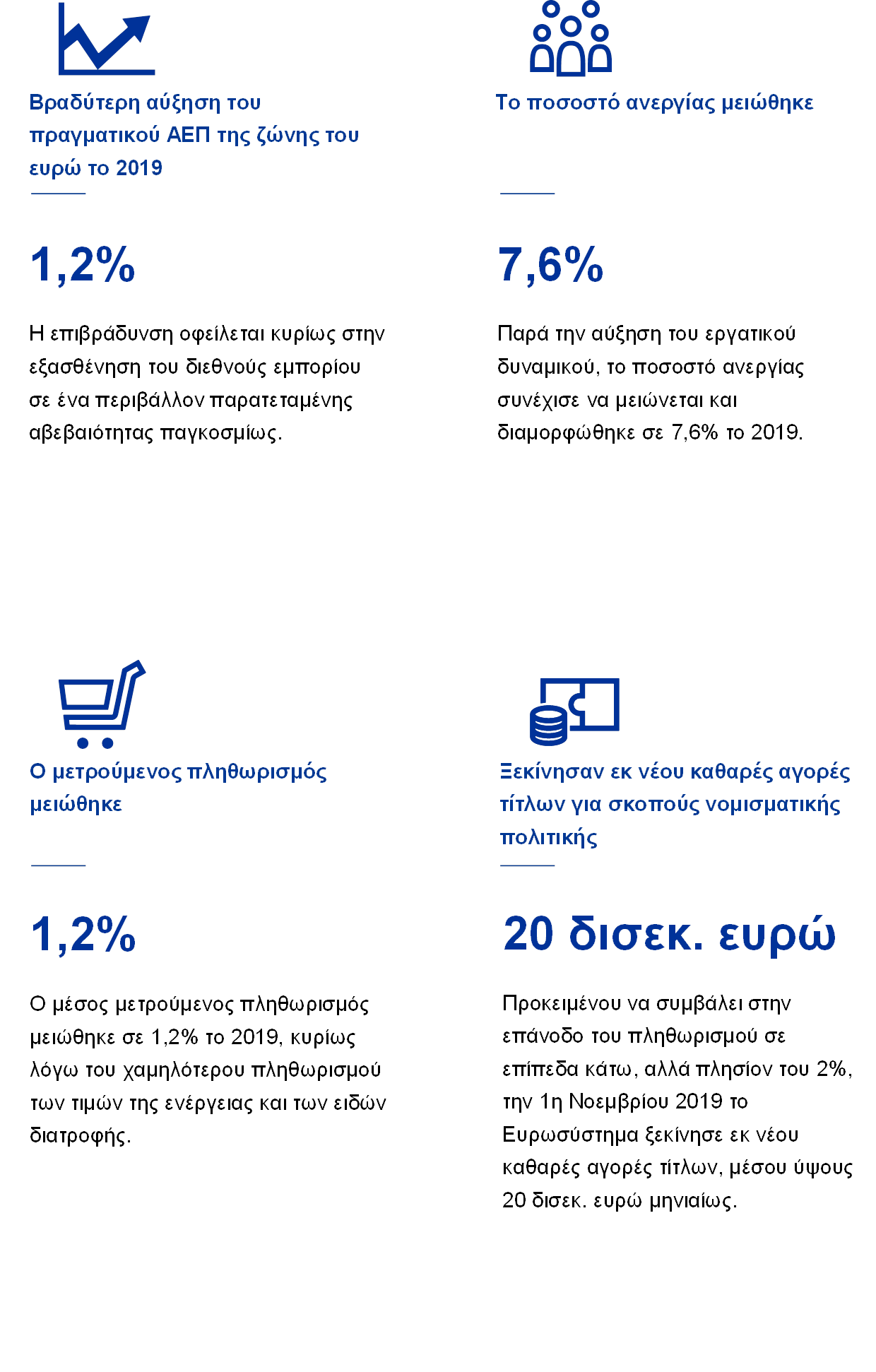 Μετά την κορύφωση που σημειώθηκε στα μέσα του 2018, η παγκόσμια οικονομία επιβραδύνθηκε σημαντικά το 2019 εν μέσω της έντονης αύξησης της αβεβαιότητας σχετικά με το διεθνές εμπόριο. Η επιβράδυνση ήταν γενικευμένη και συγχρονισμένη μεταξύ των χωρών. Υπό αυτές τις συνθήκες, ο ρυθμός ανάπτυξης της οικονομίας της ζώνης του ευρώ υποχώρησε περαιτέρω σε 1,2% από 1,9% το 2018. Η επιβράδυνση της ανάπτυξης το 2019 οφείλεται κυρίως στην εξασθένηση του διεθνούς εμπορίου σε ένα περιβάλλον παρατεταμένης αβεβαιότητας παγκοσμίως. Ταυτόχρονα, την επιβράδυνση άμβλυναν οι ευνοϊκές συνθήκες χρηματοδότησης, η περαιτέρω άνοδος της απασχόλησης και η αύξηση των μισθών, η ελαφρώς επεκτατική κατεύθυνση της δημοσιονομικής πολιτικής στη ζώνη του ευρώ, αλλά και η συνεχιζόμενη – αν και βραδύτερη – επέκταση της παγκόσμιας οικονομικής δραστηριότητας. Οι αγορές εργασίας της ζώνης του ευρώ βελτιώθηκαν περαιτέρω, ενώ ο ρυθμός αύξησης της παραγωγικότητας επιβραδύνθηκε σημαντικά. Οι πληθωριστικές πιέσεις παρέμειναν συνολικά συγκρατημένες. Ο μετρούμενος πληθωρισμός μειώθηκε σε 1,2%, εξαιτίας της υποχώρησης του πληθωρισμού των τιμών της ενέργειας και των ειδών διατροφής, ενώ ο υποκείμενος πληθωρισμός παρέμεινε υποτονικός. Οι ευνοϊκές συνθήκες χρηματοδότησης εξακολούθησαν να στηρίζουν τη νομισματική και πιστωτική επέκταση. Στη ζώνη του ευρώ, οι αποδόσεις των κρατικών ομολόγων μειώθηκαν σημαντικά, ενώ οι τιμές των μετοχών αυξήθηκαν λόγω κυρίως των χαμηλότερων προεξοφλητικών επιτοκίων. Ο πλούτος των νοικοκυριών ενισχύθηκε χάρη στις υψηλότερες αποτιμήσεις των πραγματικών και χρηματοοικονομικών περιουσιακών στοιχείων.