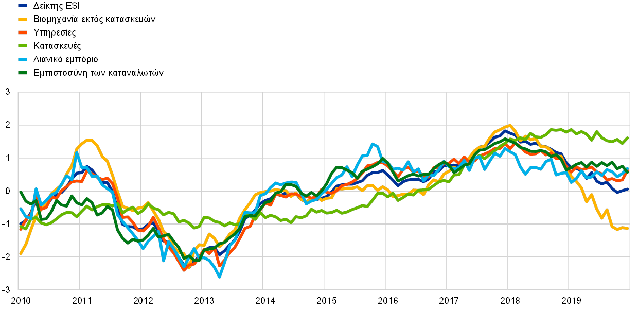 Η οικονομική επιβράδυνση το 2019 αντανακλούσε πρωτίστως την εξασθένηση του διεθνούς εμπορίου, σε συνδυασμό με τα υψηλά επίπεδα αβεβαιότητας παγκοσμίως, η οποία με τη σειρά της άσκησε αρνητική επίδραση κυρίως στον βιομηχανικό τομέα της ζώνης του ευρώ. Παράλληλα, οι τομείς των υπηρεσιών και του λιανικού εμπορίου παρέμειναν ανθεκτικοί, παρά κάποια επιβράδυνση. Αυτό φαίνεται στο Διάγραμμα A, που παρουσιάζει δείκτες εμπιστοσύνης για διάφορους τομείς της οικονομίας της ζώνης του ευρώ. Ο Δείκτης Οικονομικού Κλίματος (ESI) της Ευρωπαϊκής Επιτροπής είναι ο μεσοσταθμικός όρος του δείκτη εμπιστοσύνης στη βιομηχανία εκτός των κατασκευών (με συντελεστή στάθμισης 40%), στις υπηρεσίες (30%), στις κατασκευές (5%), στον τομέα του λιανικού εμπορίου (5%) και στα νοικοκυριά (20%). Όπως παρατηρείται, στους τομείς που είναι περισσότερο προσανατολισμένοι προς την εγχώρια αγορά (δηλ. κατασκευές, υπηρεσίες, λιανικό εμπόριο και νοικοκυριά) η επιβράδυνση ήταν πολύ λιγότερο έντονη από ό,τι στη βιομηχανία.